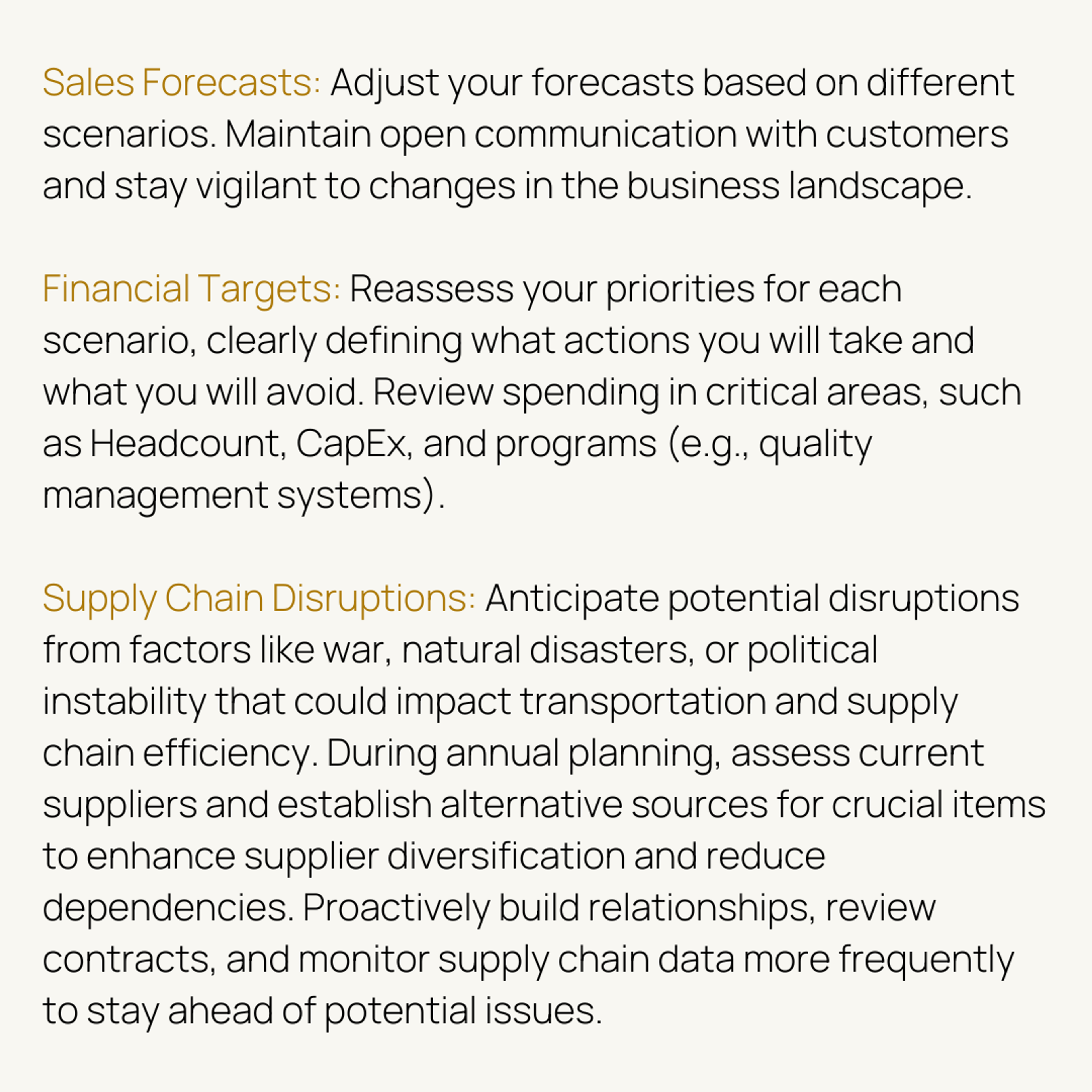 3. Operating Plan. Revisit your assumptions for the upcoming year and assess whether prolonged economic issues might affect any of your customers. Use this comprehensive annual planning guide, which emphasizes how to connect your financial performance with strategic objectives, to enhance your readiness for in-period adjustments.