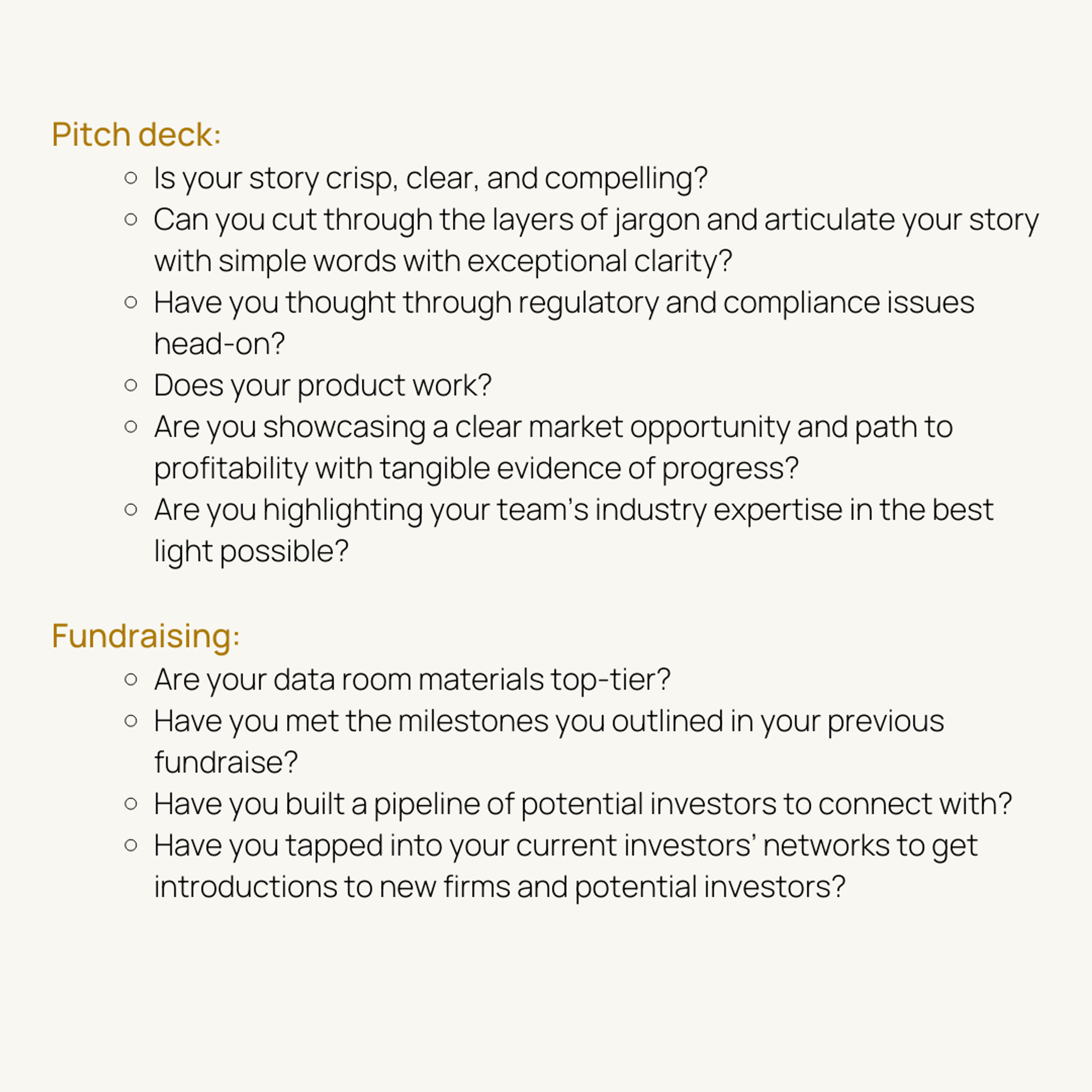 2. Fundraising. Venture capital funding has already decreased this year and we hear that many VCs are prioritizing liquidity in the current environment, making funding dollars even more difficult to come by. However, we firmly hold that there’s always capital available for exceptional companies. What does that mean for founders? If you must fundraise in the next 12 months, start your internal process earlier than you would otherwise and find new ways to stand out, be memorable, and be competitive. Don’t underestimate the importance of powerful storytelling. Here’s where to double down, especially when dealing with physical industries: