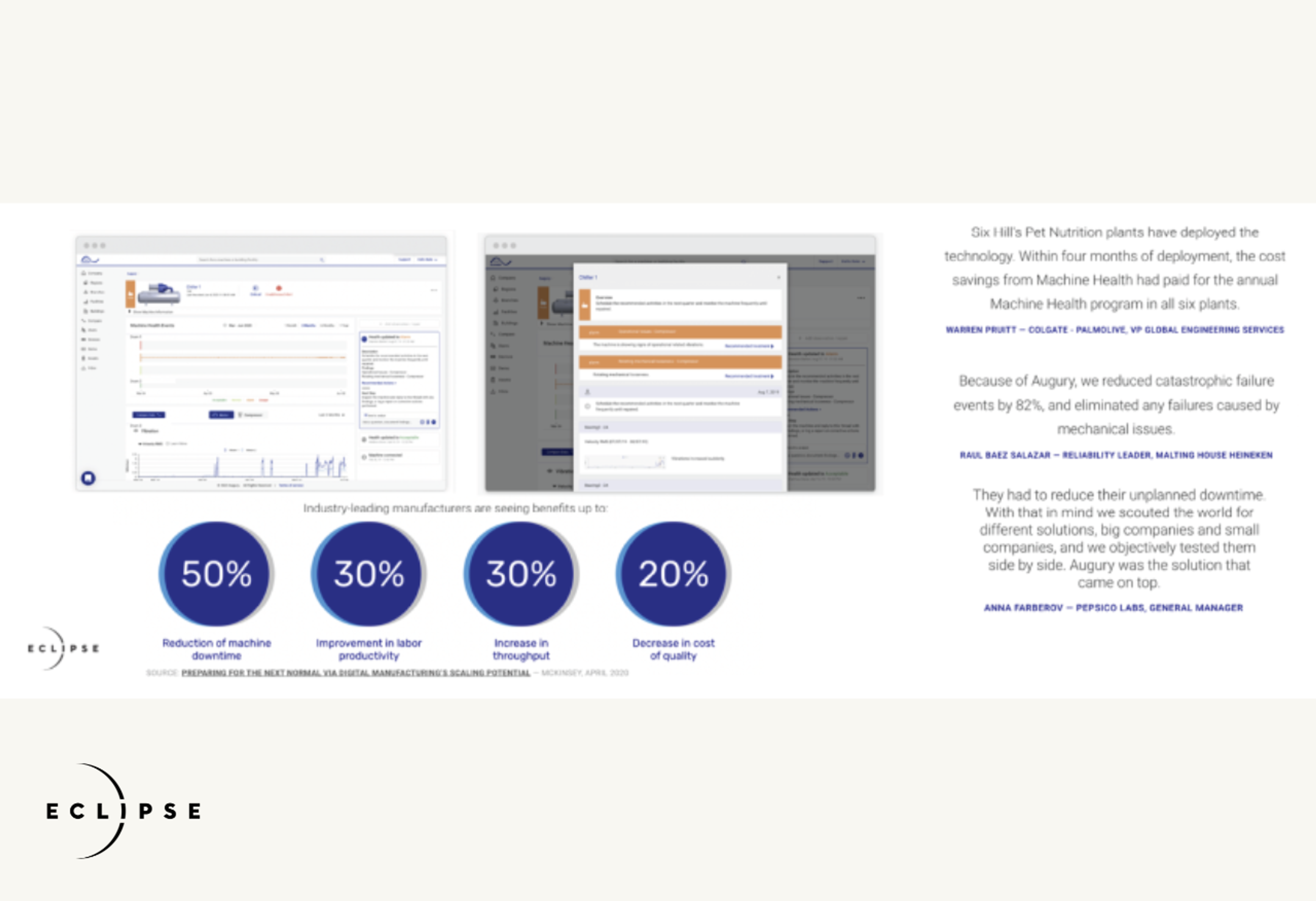4. Machine condition monitoring Mechanical issues account for 10-15% of losses in manufacturing productivity. Unplanned downtime is a significant loss-making scenario in manufacturing, and scheduled maintenance has historically been an inefficient but necessary evil. Today’s machine-monitoring solutions offer not only constant monitoring and alerting across most equipment types, but also predictive maintenance capabilities and machine learning based on large datasets across many customers and machine types, and are capable of reducing unplanned downtime by more than 50%. Below, we show UI and results by machine condition monitoring company Augury: