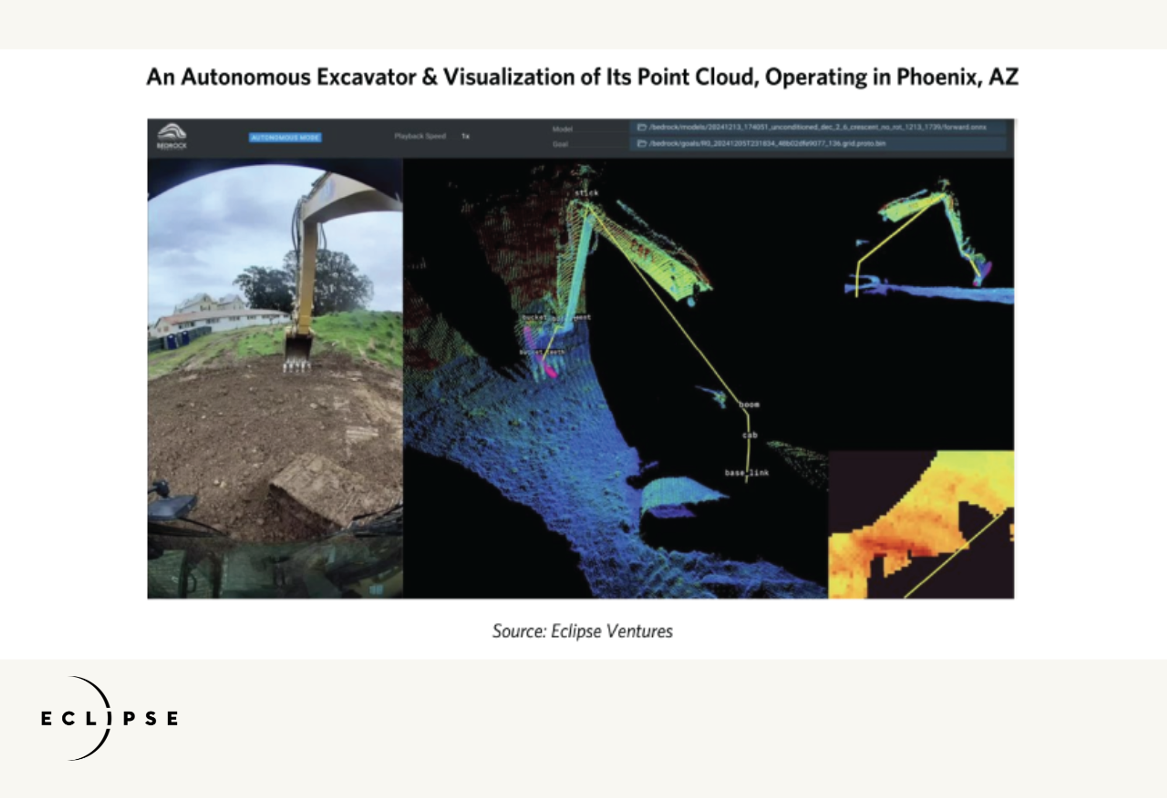 6. Embodied AI and robotics As evidenced by Waymo’s self-driving cars expanding across geographies, today’s robotics tech stack has advanced far beyond what seemed possible even just a few years ago. Self-supervised learning (SSL) models and large models (language and video) are revolutionizing robotics. Each AI era—ImageNet for vision and transformers for language—is defined by its toughest data challenges. The next frontier—embodied AI—is a term for advanced, applied robotics, like Waymo vehicles, and is already taking hold across industrial and manufacturing environments. The lessons from the first million autonomous miles driven at Waymo can now be applied to adjacent industries (such as construction and other heavy equipment operations, as pictured below). Adding industrial capacity (building plants, fabricating tooling, producing steel, and other key inputs) is as important as improving manufacturing throughput, and embodied AI’s capabilities to support large-scale, foundational industrial workloads in construction, warehousing, agriculture, and manufacturing may be critical to the generational transformation needed for a broader-scale U.S. manufacturing capacity build-out.